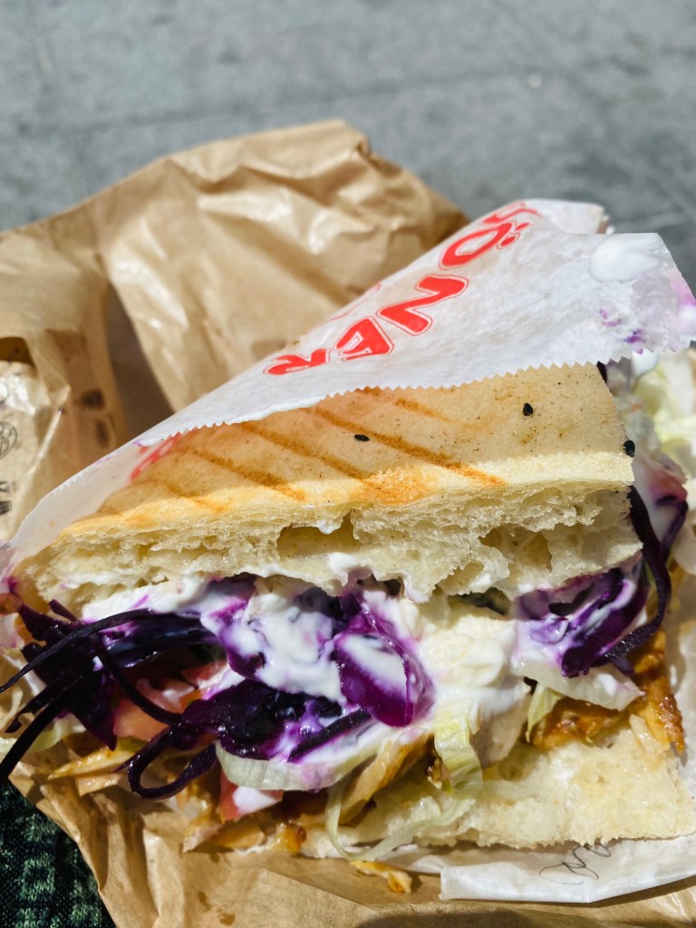Ce kebab vaut il 1h15 d’attente ? Les personnes n’ayant plus les papilles gustatives actives comme moi non diront bien sûr HELL NO ! Mais je voulais profiter du beau temps et de ce court séjour pour quand même y passer. Peut être que si je retrouve mes sens dans quelques mois j’y retournerai avec plaisir. L’avis de mon chéri, très bon, il donne 7/10, le pain est ce qu’il a préféré mais un peu trop garnis de légumes. En effet, j’avais moi même beaucoup de choux qui débordait du sandwich.